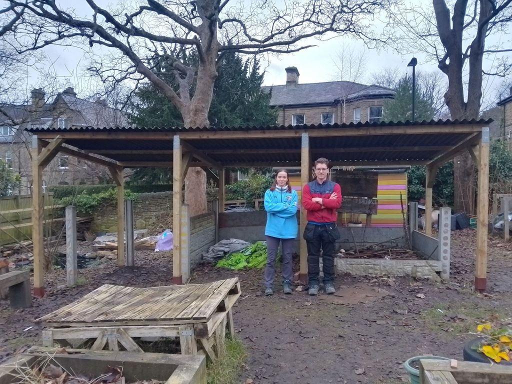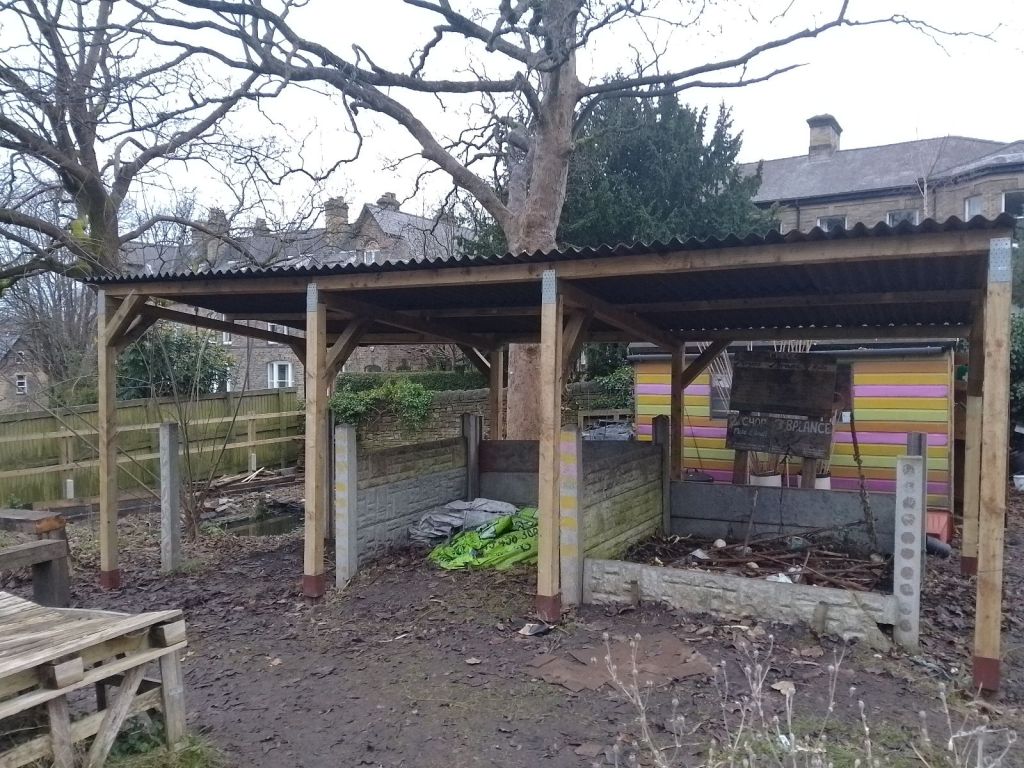 The project involved building a rainwater harvesting shelter over the compost bays in the university allotment. The structure has a slanted roof and guttering that will direct the water into a water butt to be used in the allotments to reduce water usage.